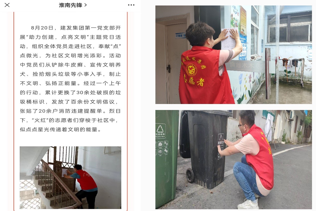 為不斷提升黨支部組織生活質(zhì)效,增強(qiáng)基層黨組織凝聚力和戰(zhàn)斗力,第一黨支部堅(jiān)持把組織生活與企業(yè)發(fā)展、服務(wù)社會(huì)、城市治理等緊密結(jié)合,以“主題黨日”為重要抓手,引導(dǎo)黨員在基層一線亮身份、銘初心、擔(dān)使命,以實(shí)際行動(dòng)踐行黨的宗旨,充分發(fā)揮模范帶頭作用。8月份組織開展的“助力創(chuàng)建,點(diǎn)亮文明”主題黨日活動(dòng)入選了市委組織部優(yōu)秀主題黨日活動(dòng)案例,在“淮南先鋒”公眾號(hào)刊登。