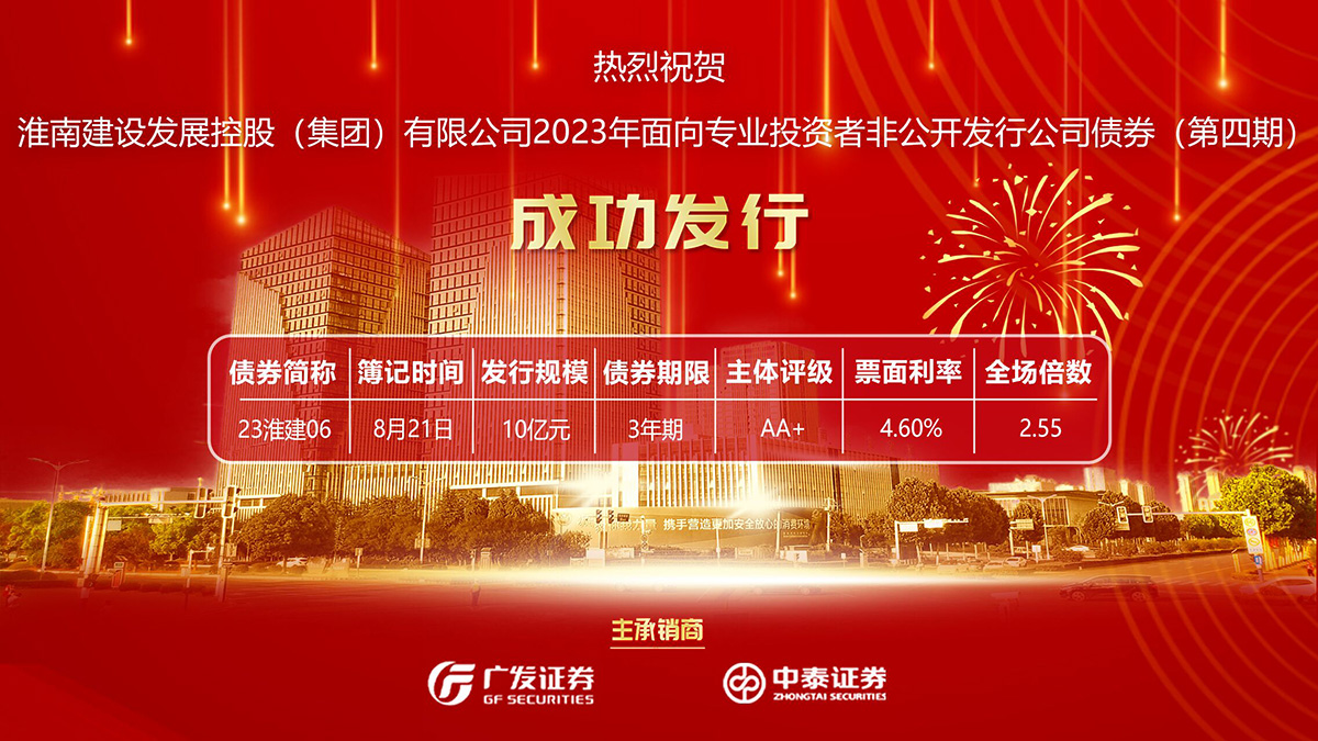 8月21日,淮南建設(shè)發(fā)展控股(集團)有限公司2023年第四期非公開發(fā)行公司債成功簿記發(fā)行,發(fā)行規(guī)模10億元,全場認購倍數(shù)2.55倍,票面發(fā)行利率4.6%。