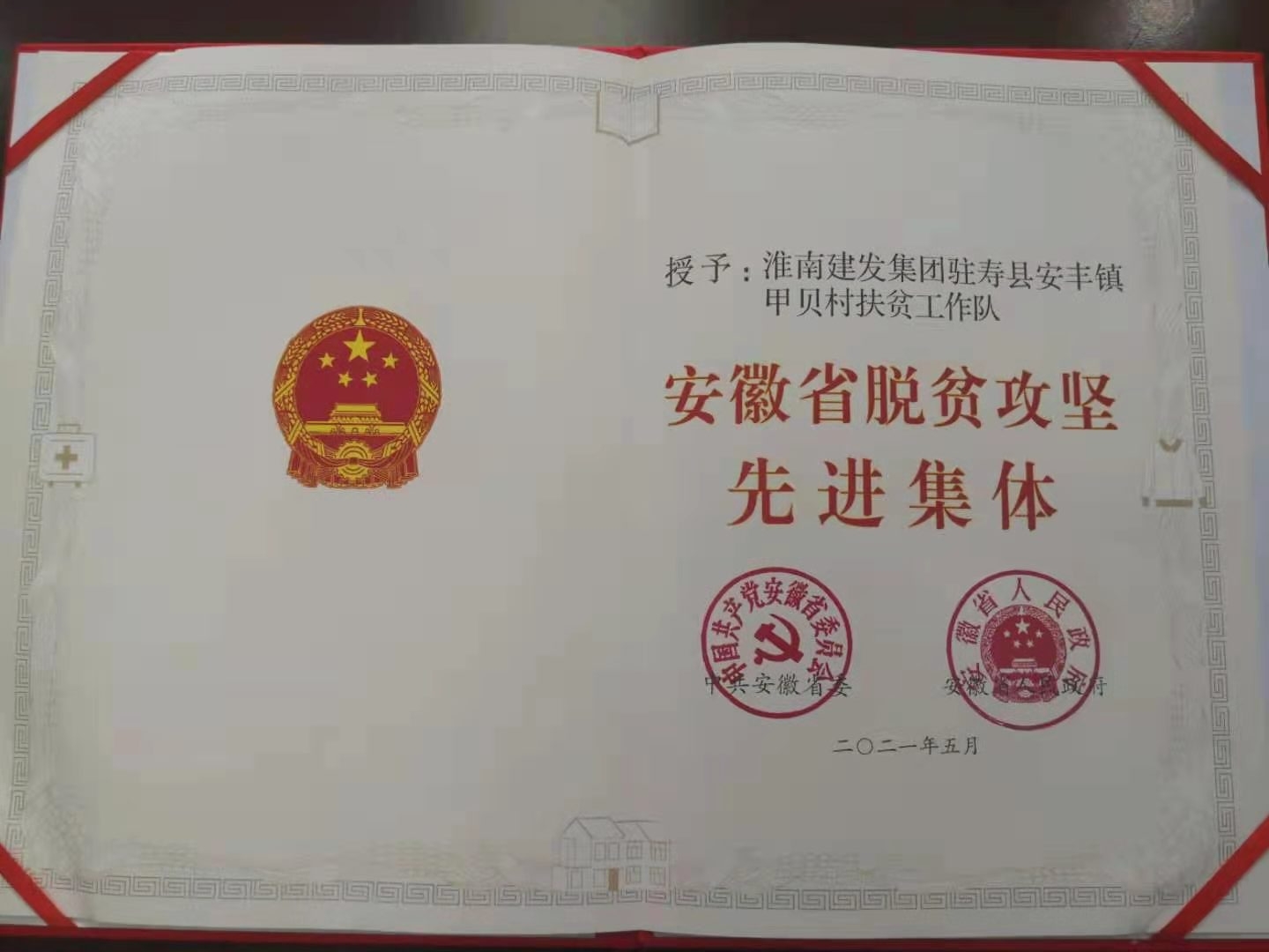 會議宣讀了《中共安徽省委安徽省人民政府關(guān)于表彰安徽省脫貧攻堅先進個人和先進集體的決定》,省領(lǐng)導(dǎo)為受表彰的先進個人和先進集體代表頒獎。建發(fā)集團駐壽縣安豐鎮(zhèn)甲貝村駐村工作隊在表彰中獲“安徽省脫貧攻堅先進集體”榮譽稱號。