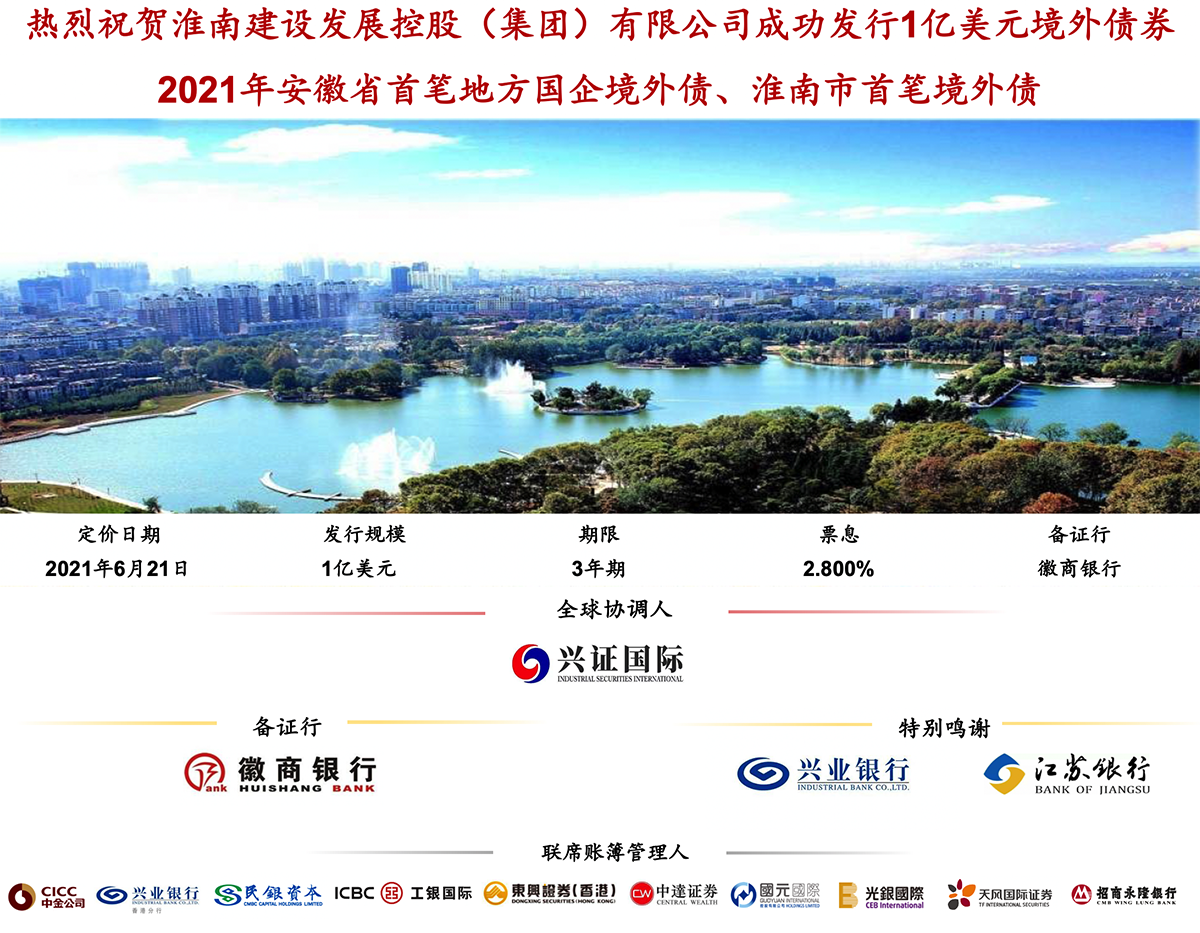 6月21日,建發(fā)集團成功定價發(fā)行首期1億美元境外債券,期限3年,票面利率2.8%,由徽商銀行提供備證。本期債券為2021年安徽省首筆地方國企境外債、淮南市首筆境外債。