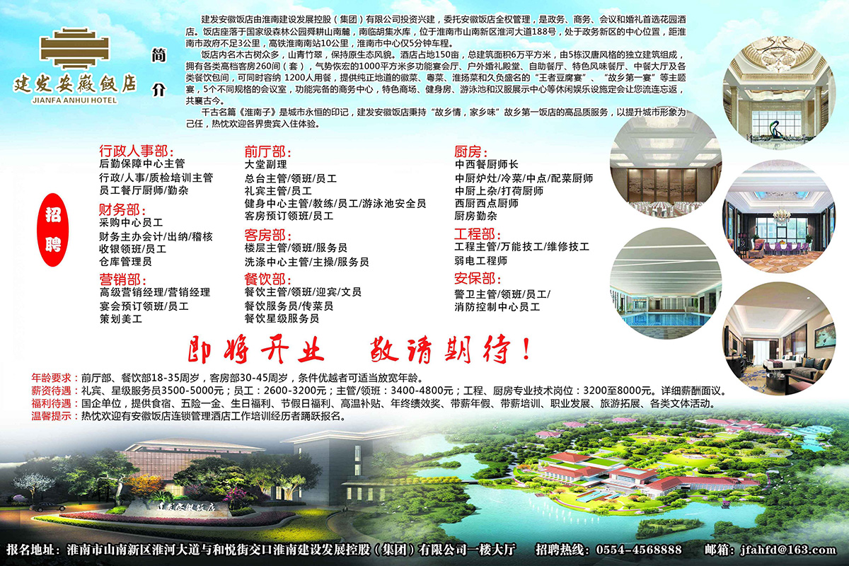 建發(fā)安徽飯店由淮南建設(shè)發(fā)展控股(集團)有限公司投資興建,委托安徽飯店全權(quán)管理,是政務(wù)、商務(wù)、會議和婚禮首選花園酒店。飯店座落于國家級森林公園舜耕山南麓,南臨胡集水庫,位于淮南市山南新區(qū)淮河大道188號,處于政務(wù)新區(qū)的中心位置,距淮南市政府不足3公里,高鐵淮南南站10公里,淮南市中心僅5分鐘車程。