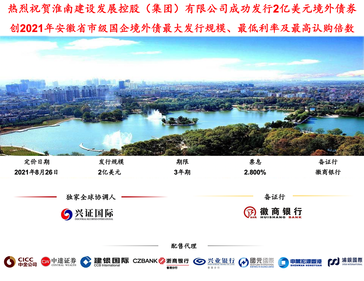 8月26日,淮南建設(shè)發(fā)展控股(集團(tuán))有限公司2021年度第二期境外美元債成功發(fā)行,金額2億美元,期限3年,票面利率2.8%。發(fā)行過程中,我公司克服困難,積極與債券承銷商興業(yè)國際證券進(jìn)行溝通,努力協(xié)調(diào)備證行和投資者,保障了本期債券成功發(fā)行。