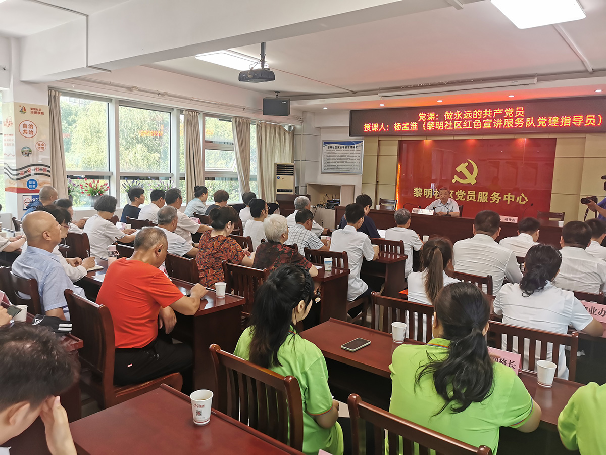 在升國旗環(huán)節(jié),鮮艷的五星紅旗在莊嚴的國歌聲中冉冉升起,現(xiàn)場所有黨員面向國旗行注目禮,神情莊重肅穆;升旗儀式結(jié)束后,黨員們面對鮮紅的黨旗,一起緊握右拳,懷著激動的心情重溫了入黨誓詞;隨后,社區(qū)黨建指導員以“做永遠的共產(chǎn)黨員”為題,從“為什么要做永遠的共產(chǎn)黨員,什么樣才是永遠的共產(chǎn)黨員,怎么樣能做永遠的共產(chǎn)黨員”三個方面,結(jié)合社區(qū)黨建工作實際,給大家上了一堂生動深刻的黨課,精彩的內(nèi)容,引得現(xiàn)場陣陣掌聲。
