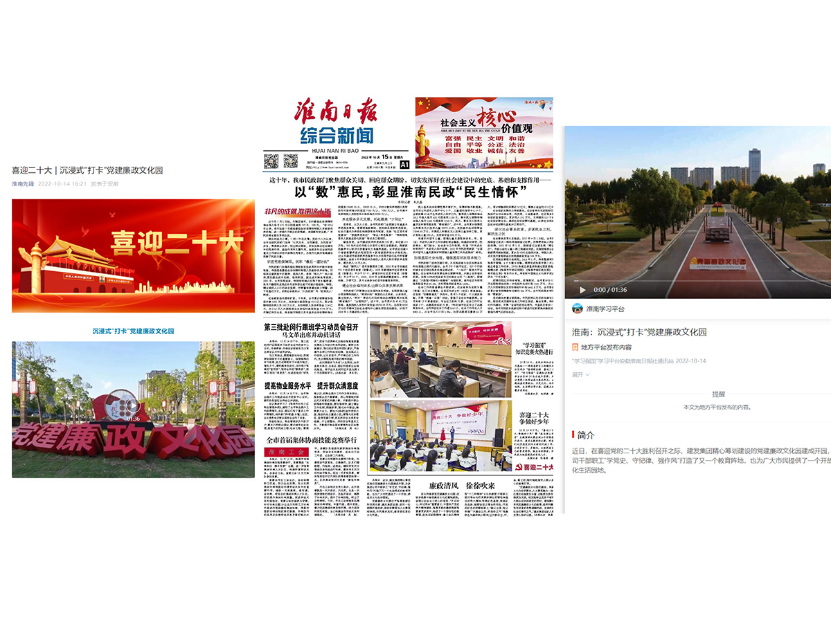 在祖國73周年華誕和中國共產(chǎn)黨第二十次全國代表大會勝利召開之際,建發(fā)集團(tuán)黨建廉政文化園建成開園,淮南先鋒網(wǎng)、學(xué)習(xí)強(qiáng)國淮南平臺和淮南日報(bào)同步對集團(tuán)公司黨建廉政文化園進(jìn)行了宣傳介紹。