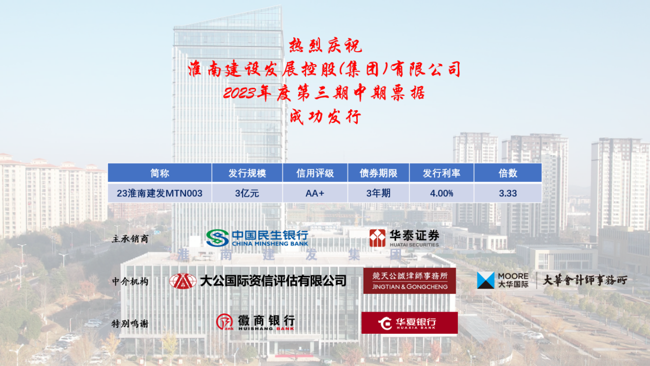 8月9日,淮南建設(shè)發(fā)展控股(集團(tuán))有限公司2023年第三期中期票據(jù)簿記發(fā)行,發(fā)行規(guī)模3億元,評(píng)級(jí)AA+,全場(chǎng)認(rèn)購(gòu)倍數(shù)3.33倍,票面發(fā)行利率4%。本期中期票據(jù)為建發(fā)集團(tuán)取得AA+評(píng)級(jí)后首次在債券資本市場(chǎng)亮相,同時(shí)也是淮南市屬國(guó)有企業(yè)首次以AA+主體發(fā)行債券。