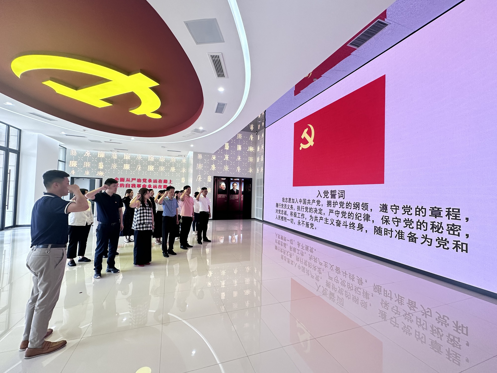 參觀中,黨員們領(lǐng)略了中華民族自古以來的廉政文化精髓,從古代清官廉吏的嘉言懿行到革命先輩的廉潔自律事跡,深刻感受到廉政文化的深厚底蘊和傳承價值。通過一樁樁、一件件反面典型案例,深刻揭露了腐敗分子因思想滑坡、信念動搖、貪欲膨脹而導(dǎo)致的嚴(yán)重后果,讓大家真切地感受到“莫伸手,伸手必被捉”的深刻警示。隨后,全體黨員重溫了入黨誓詞。面對鮮紅的黨旗,大家高舉右手,莊嚴(yán)宣誓,鏗鏘有力的誓言在大廳內(nèi)回蕩,表達(dá)了對黨的忠誠和為黨的事業(yè)奮斗終身的堅定決心。